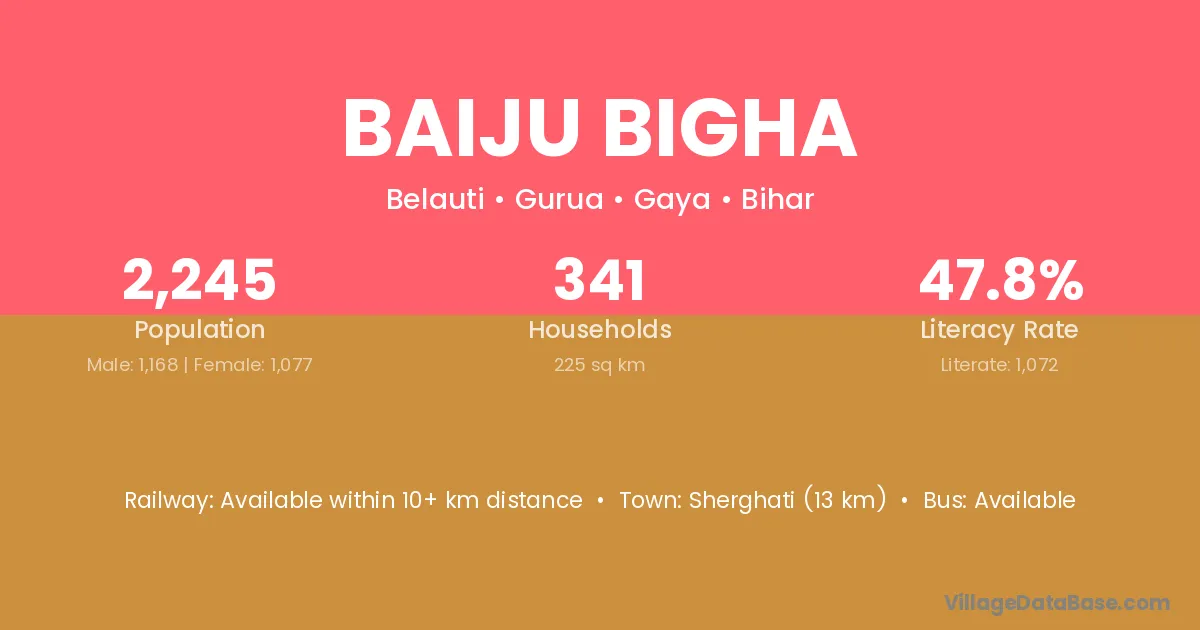 Sherghati (13 km) is the nearest town to Baiju Bigha village for major economic activities and is located approximately 13 km away.