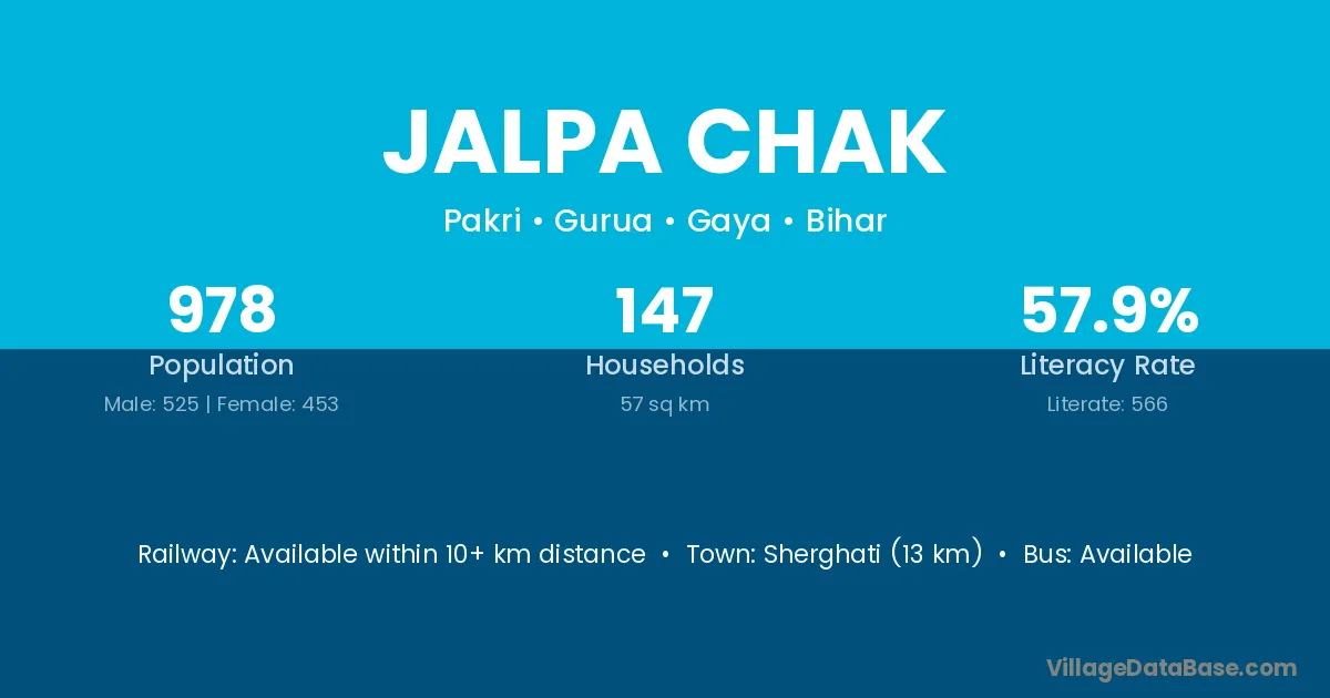 Jalpa Chak village has a total population of 978 people, of which 525 are males and 453 are females.