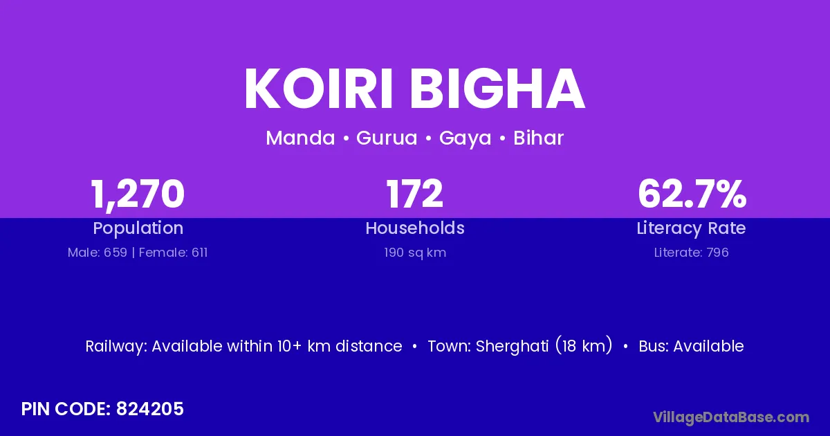 Sherghati (18 km) is the nearest town to Koiri Bigha village for major economic activities and is located approximately 18 km away.