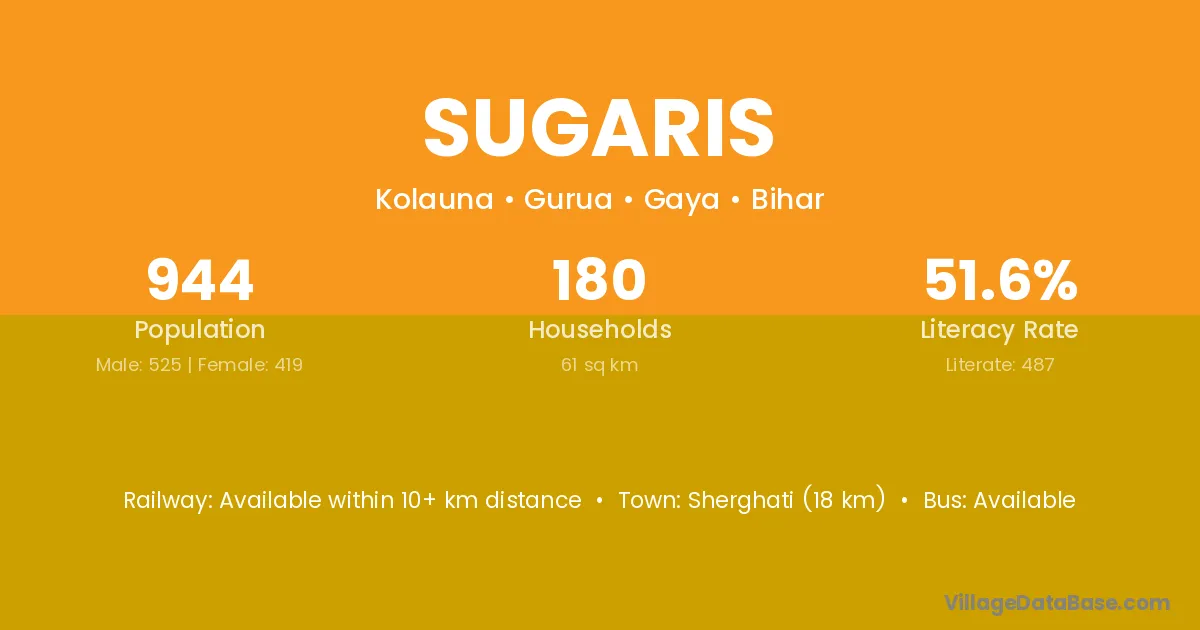 Sherghati (18 km) is the nearest town to Sugaris village for major economic activities and is located approximately 18 km away.
