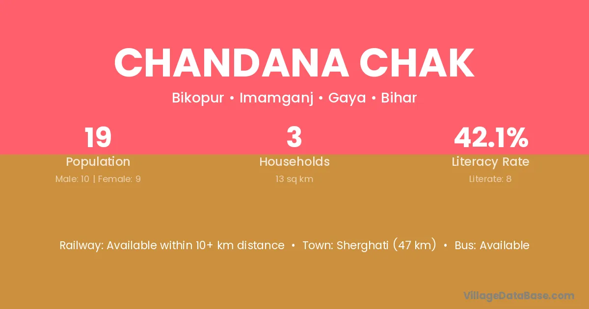 Sherghati (47 km) is the nearest town to Chandana Chak village for major economic activities and is located approximately 47 km away.