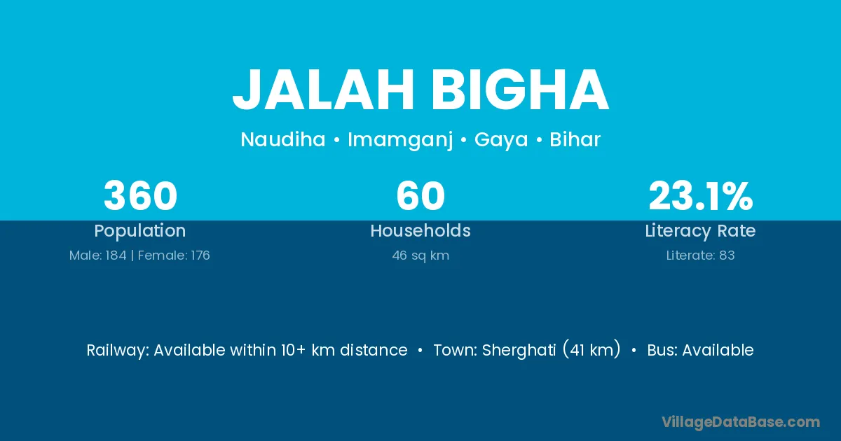 Jalah Bigha village has a total population of 360 people, of which 184 are males and 176 are females.