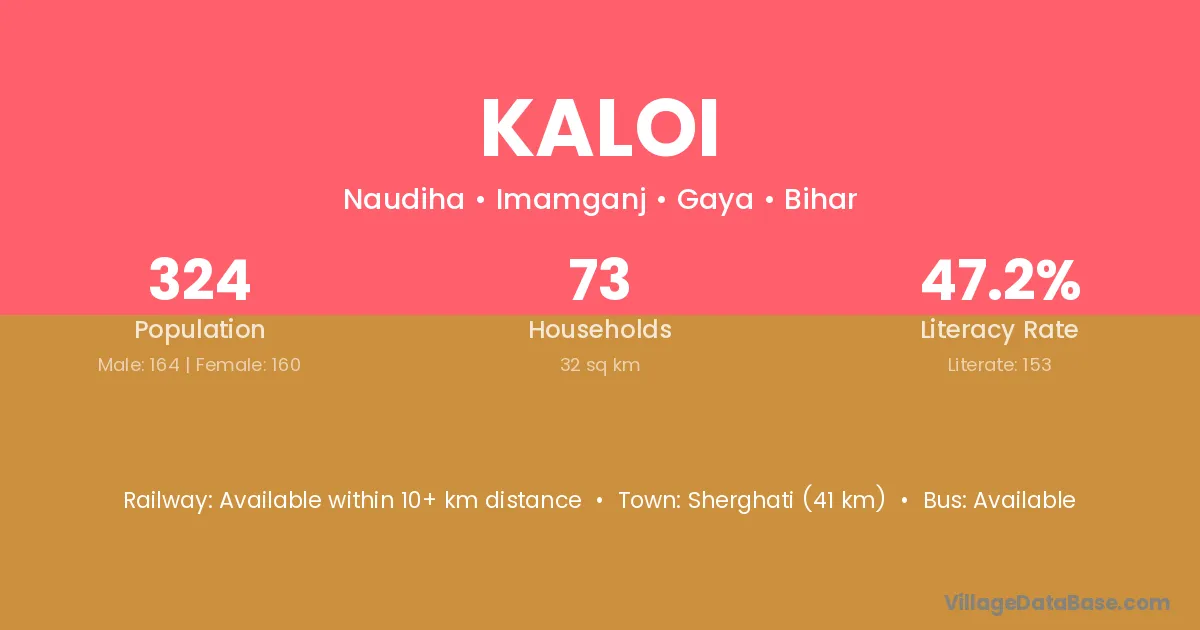 Sherghati (41 km) is the nearest town to Kaloi village for major economic activities and is located approximately 41 km away.