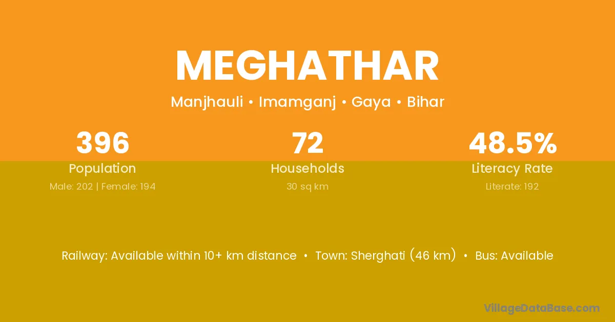Sherghati (46 km) is the nearest town to Meghathar village for major economic activities and is located approximately 46 km away.
