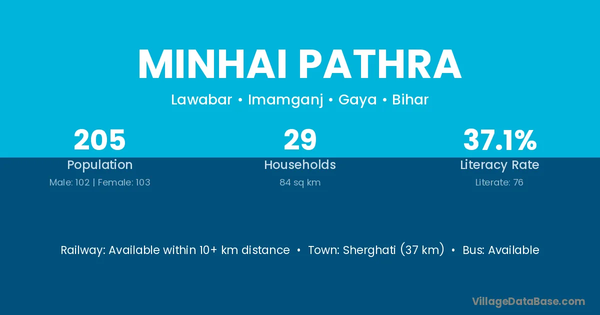 Sherghati (37 km) is the nearest town to Minhai Pathra village for major economic activities and is located approximately 37 km away.