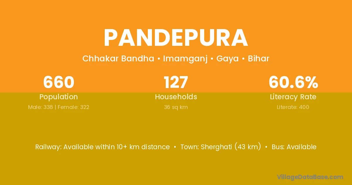 Sherghati (43 km) is the nearest town to Pandepura village for major economic activities and is located approximately 43 km away.