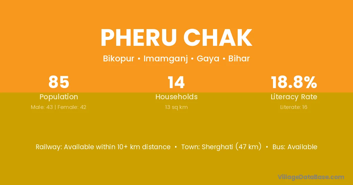 Sherghati (47 km) is the nearest town to Pheru Chak village for major economic activities and is located approximately 47 km away.