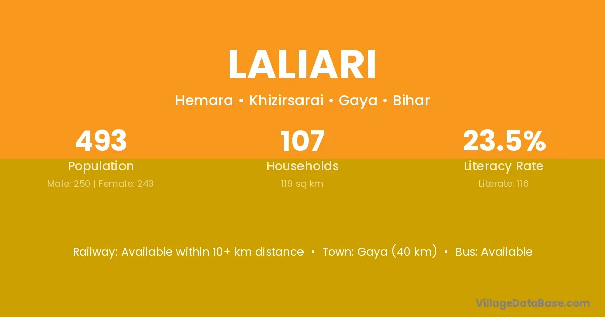 Gaya (40 km) is the nearest town to Laliari village for major economic activities and is located approximately 40 km away.