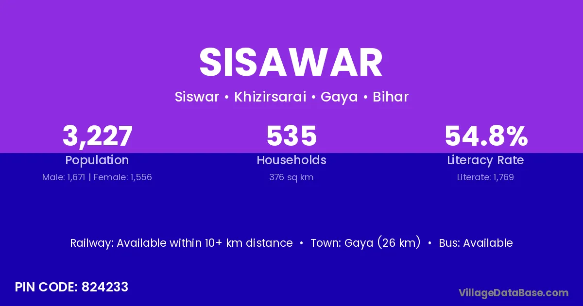 Gaya (26 km) is the nearest town to Sisawar village for major economic activities and is located approximately 26 km away.