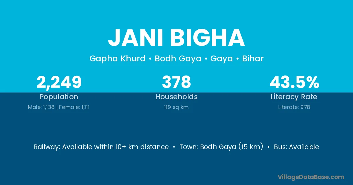 Tikari (22 km) is the nearest town to Jani Bigha village for major economic activities and is located approximately 22 km away.