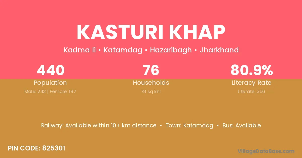 Tikari (17 km) is the nearest town to Kasturi Khap village for major economic activities and is located approximately 17 km away.
