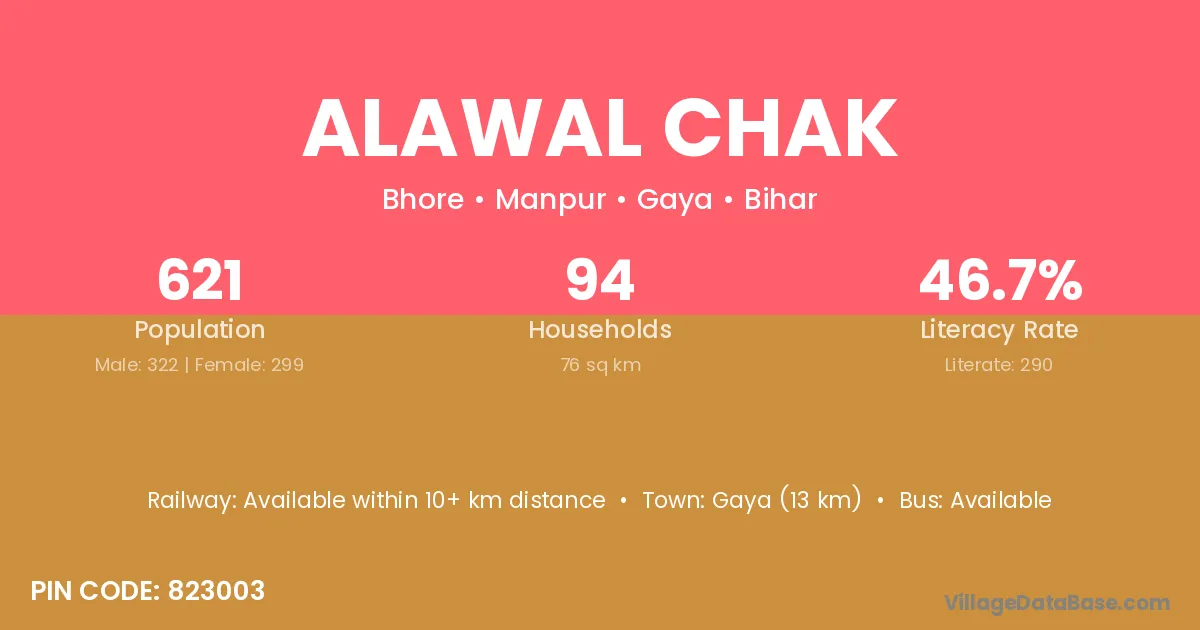 Gaya (13 km) is the nearest town to Alawal Chak village for major economic activities and is located approximately 13 km away.