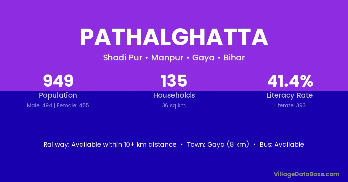 Pathalghatta village has a total population of 949 people, of which 494 are males and 455 are females.