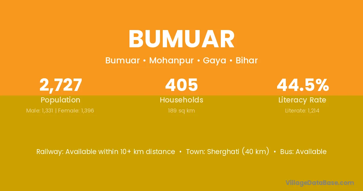 Sherghati (40 km) is the nearest town to Bumuar village for major economic activities and is located approximately 40 km away.