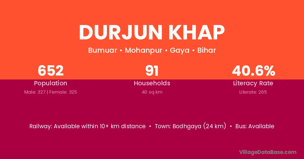 Bodhgaya (24 km) is the nearest town to Durjun Khap village for major economic activities and is located approximately 24 km away.