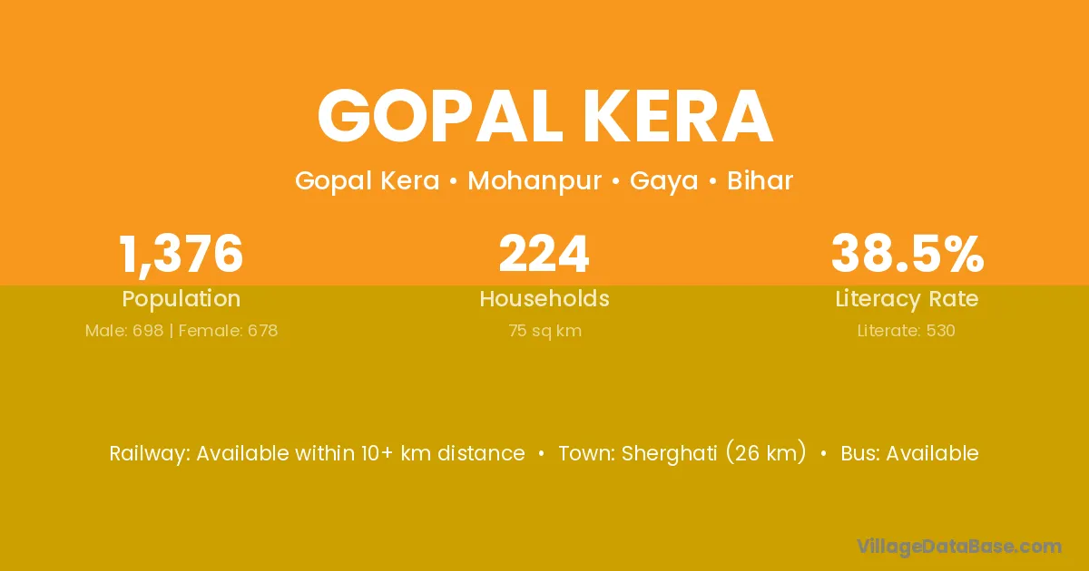 Sherghati (26 km) is the nearest town to Gopal Kera village for major economic activities and is located approximately 26 km away.