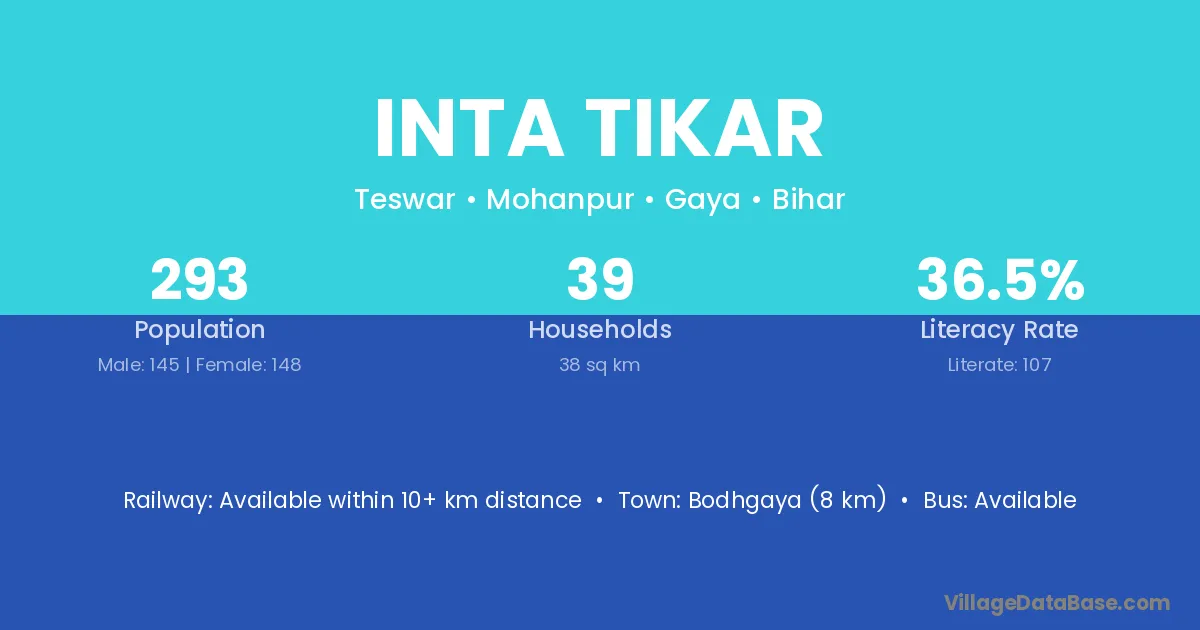 Bodhgaya (8 km) is the nearest town to Inta Tikar village for major economic activities and is located approximately 8 km away.