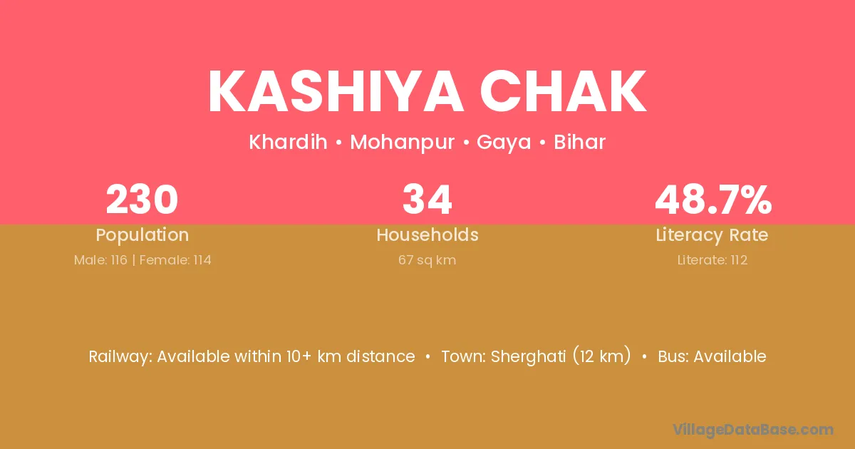 Kashiya Chak village has a total population of 230 people, of which 116 are males and 114 are females.