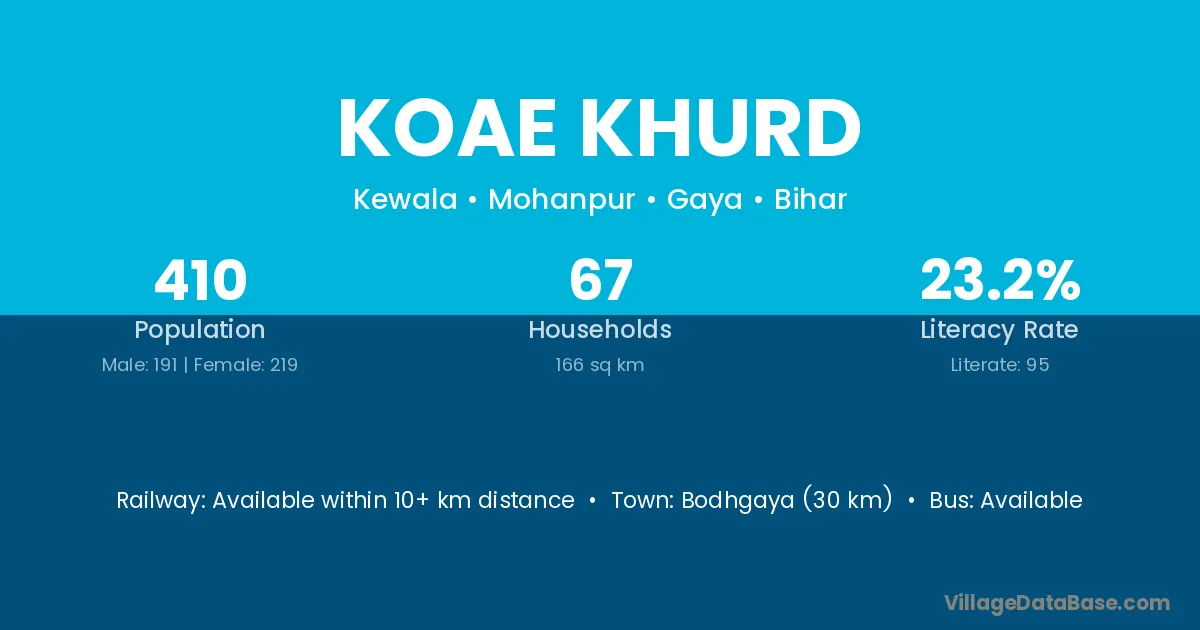 Bodhgaya (30 km) is the nearest town to Koae Khurd village for major economic activities and is located approximately 30 km away.