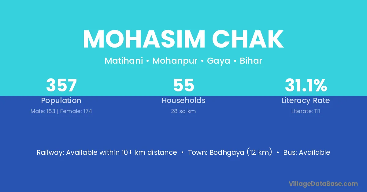 Bodhgaya (12 km) is the nearest town to Mohasim Chak village for major economic activities and is located approximately 12 km away.