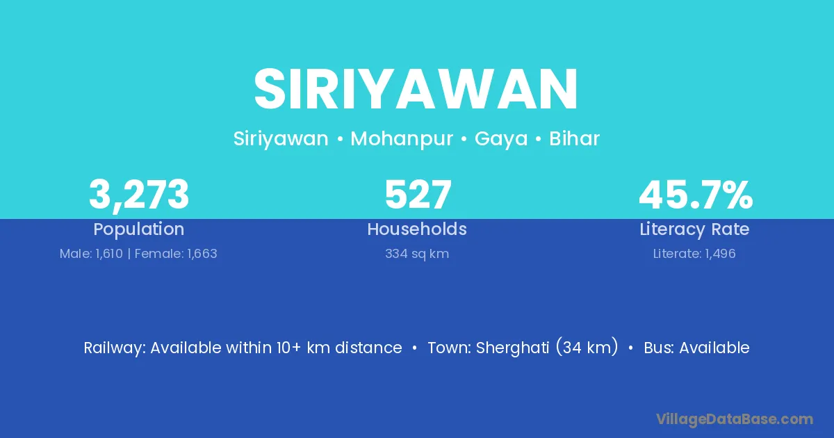 Sherghati (34 km) is the nearest town to Siriyawan village for major economic activities and is located approximately 34 km away.