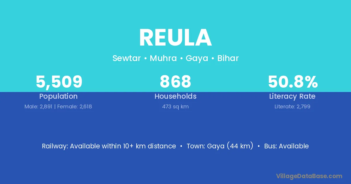 Gaya (44 km) is the nearest town to Reula village for major economic activities and is located approximately 44 km away.