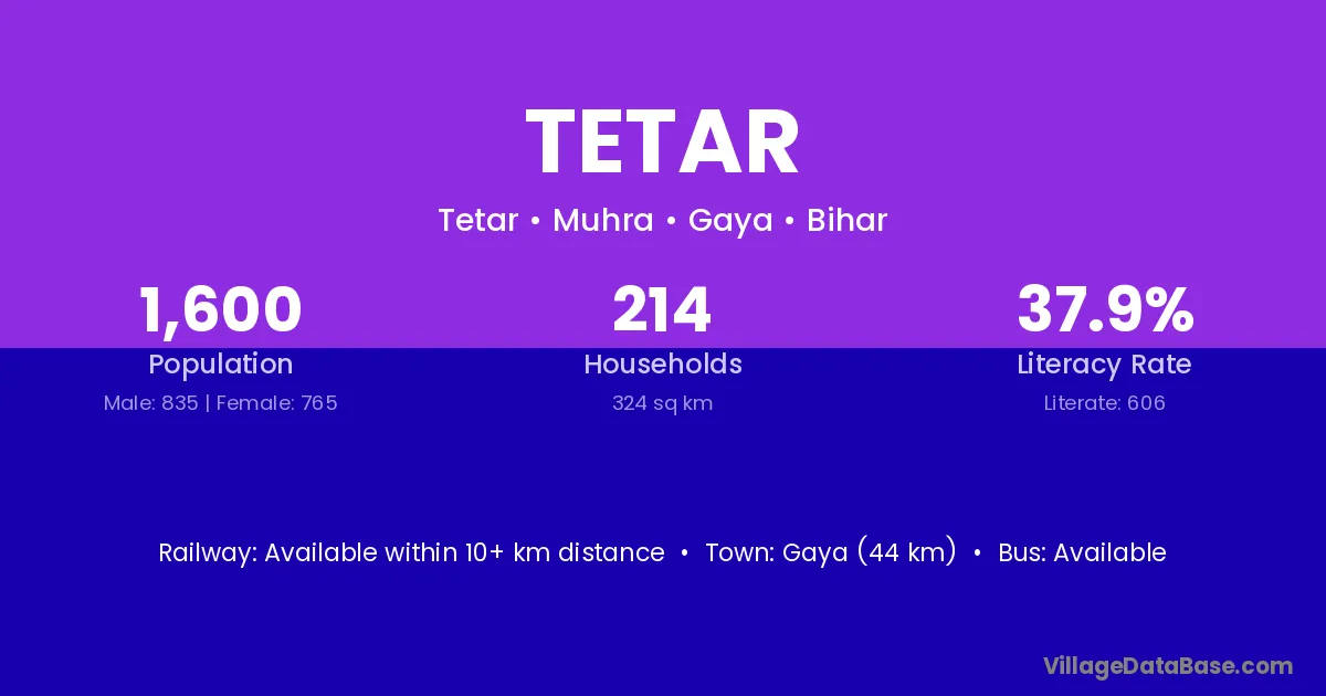 Gaya (44 km) is the nearest town to Tetar village for major economic activities and is located approximately 44 km away.