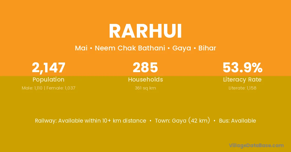 Gaya (42 km) is the nearest town to Rarhui village for major economic activities and is located approximately 42 km away.