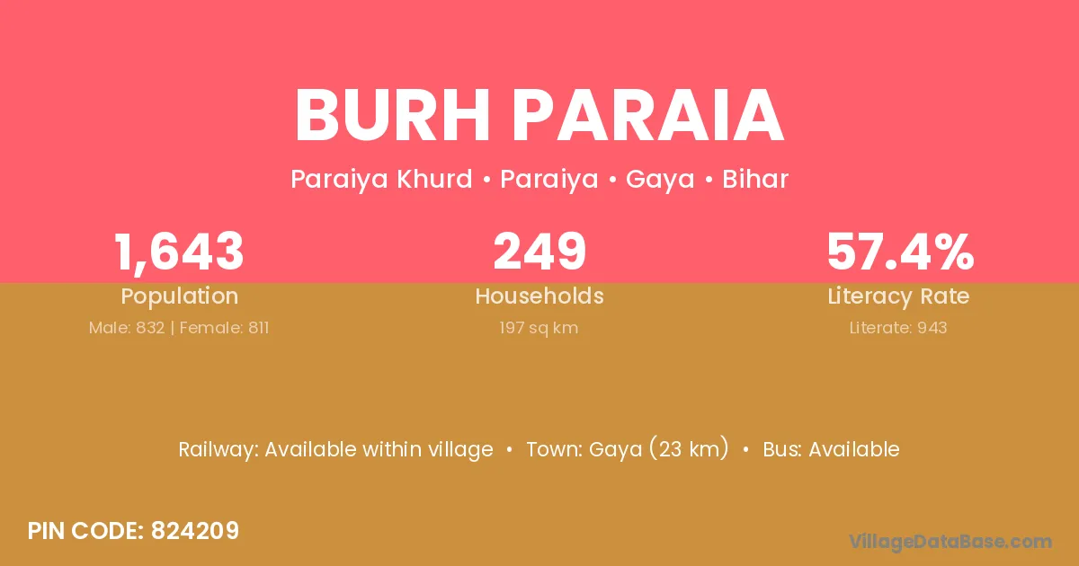 Gaya (23 km) is the nearest town to Burh Paraia village for major economic activities and is located approximately 23 km away.