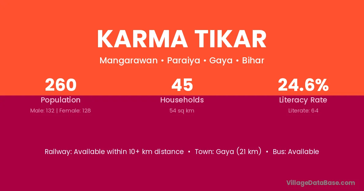 Karma Tikar village has a total population of 260 people, of which 132 are males and 128 are females.