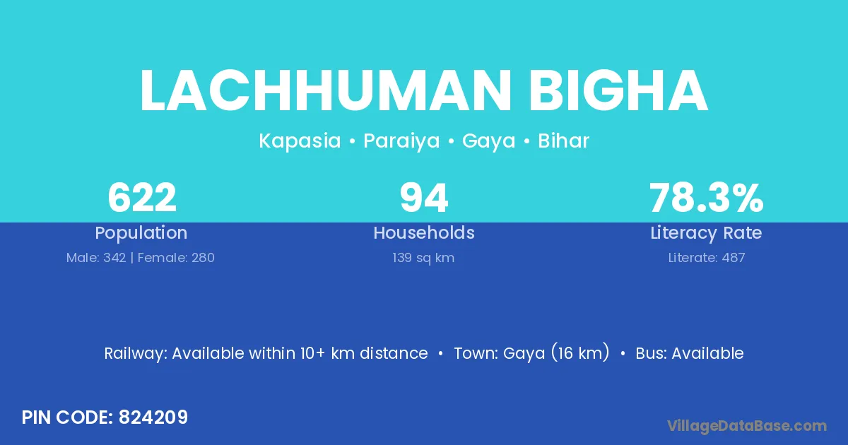 Gaya (16 km) is the nearest town to Lachhuman Bigha village for major economic activities and is located approximately 16 km away.
