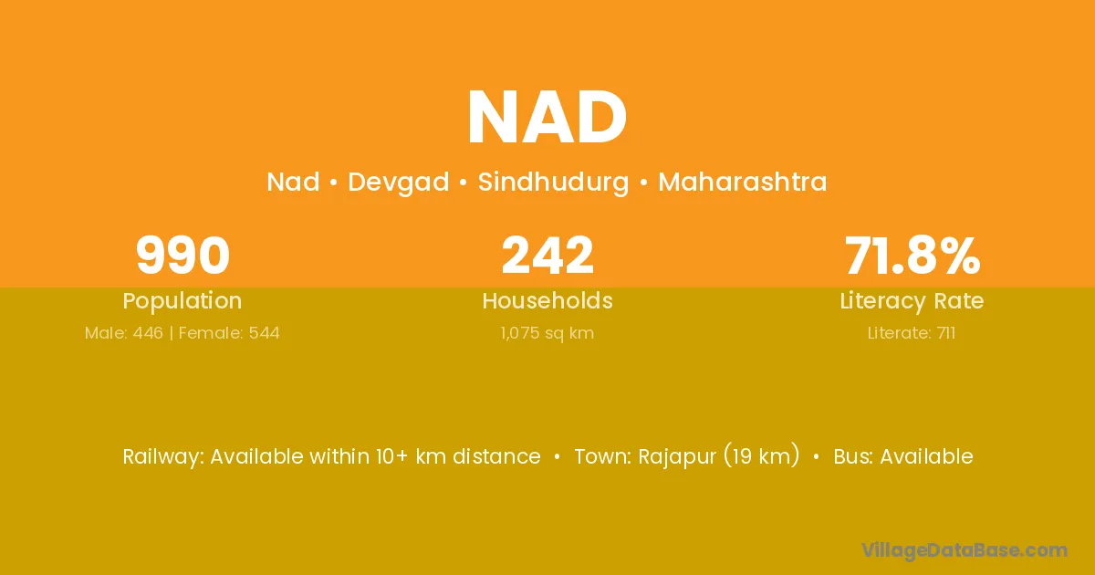 The literacy rate of Nad village is 53.29%. Male literacy stands at 64.65% and female literacy at 36.76%.