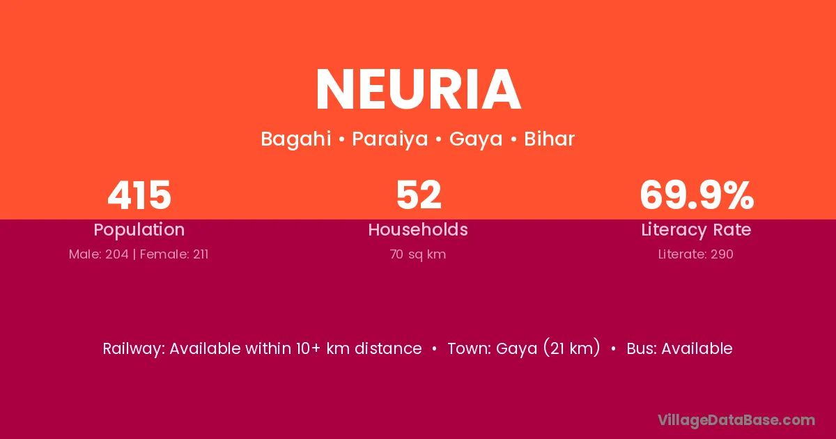 Gaya (21 km) is the nearest town to Neuria village for major economic activities and is located approximately 21 km away.