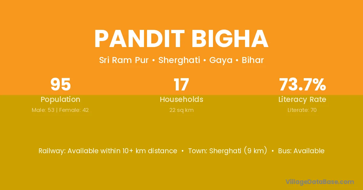 Pandit Bigha village has a total population of 95 people, of which 53 are males and 42 are females.