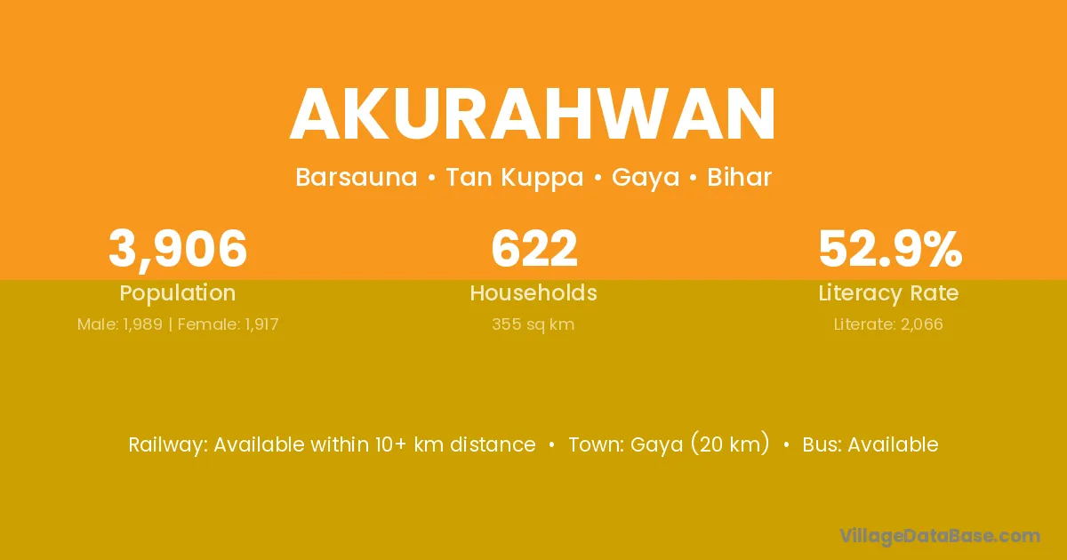 Gaya (20 km) is the nearest town to Akurahwan village for major economic activities and is located approximately 20 km away.