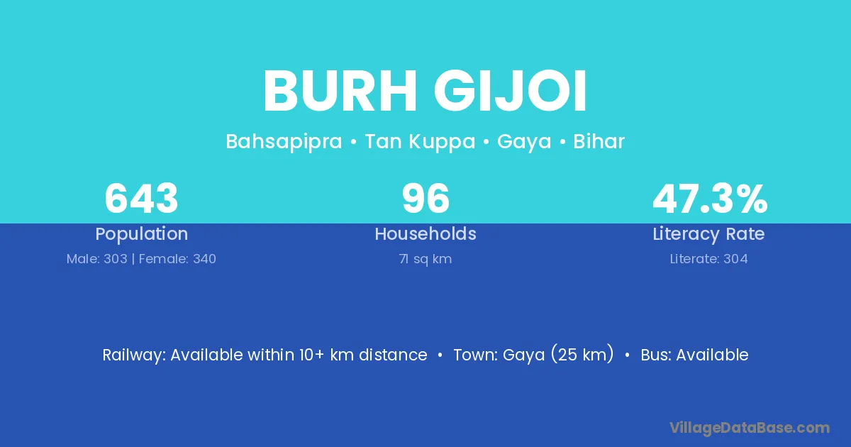 Burh Gijoi village has a total population of 643 people, of which 303 are males and 340 are females.