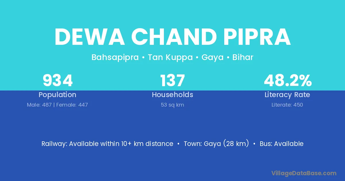 Gaya (28 km) is the nearest town to Dewa Chand Pipra village for major economic activities and is located approximately 28 km away.
