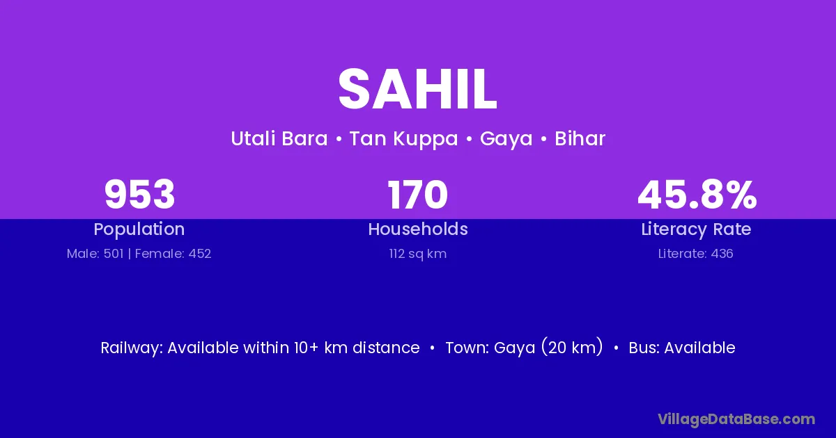Gaya (20 km) is the nearest town to Sahil village for major economic activities and is located approximately 20 km away.