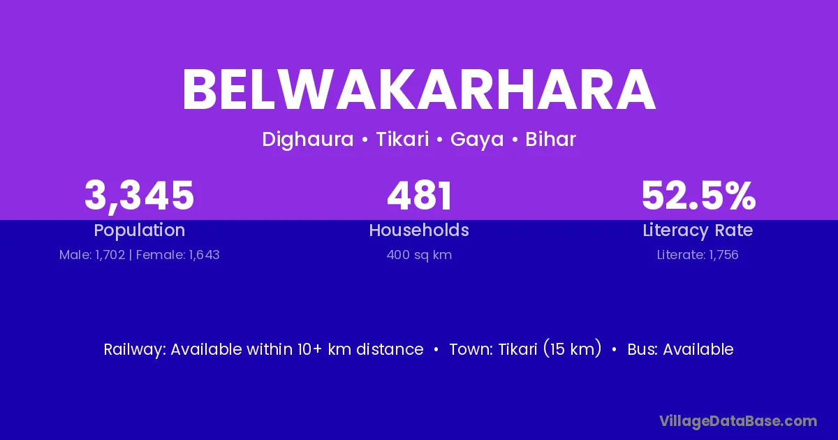 Tikari (15 km) is the nearest town to Belwakarhara village for major economic activities and is located approximately 15 km away.