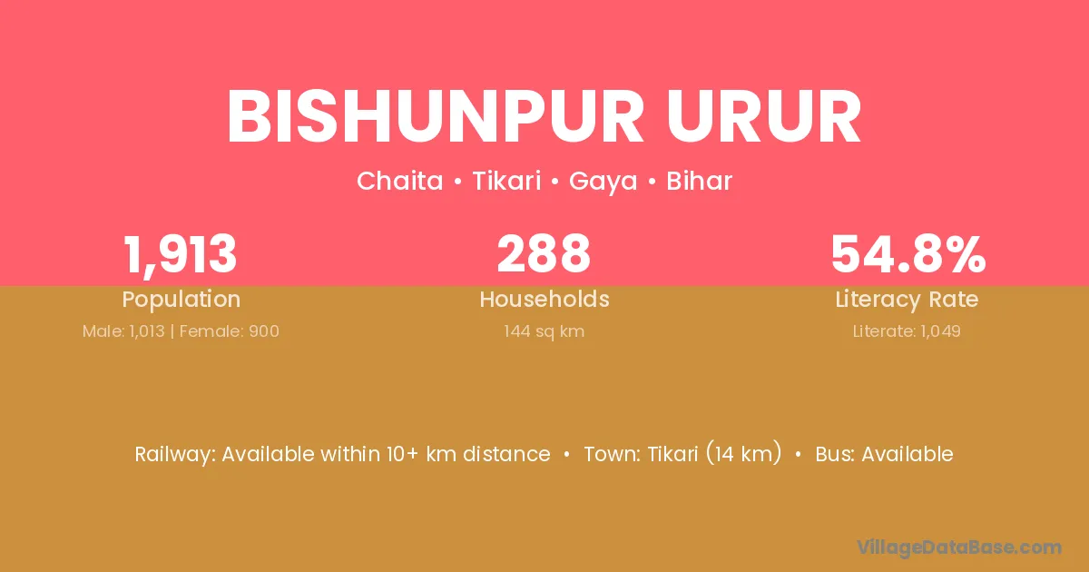 Tikari (14 km) is the nearest town to Bishunpur Urur village for major economic activities and is located approximately 14 km away.