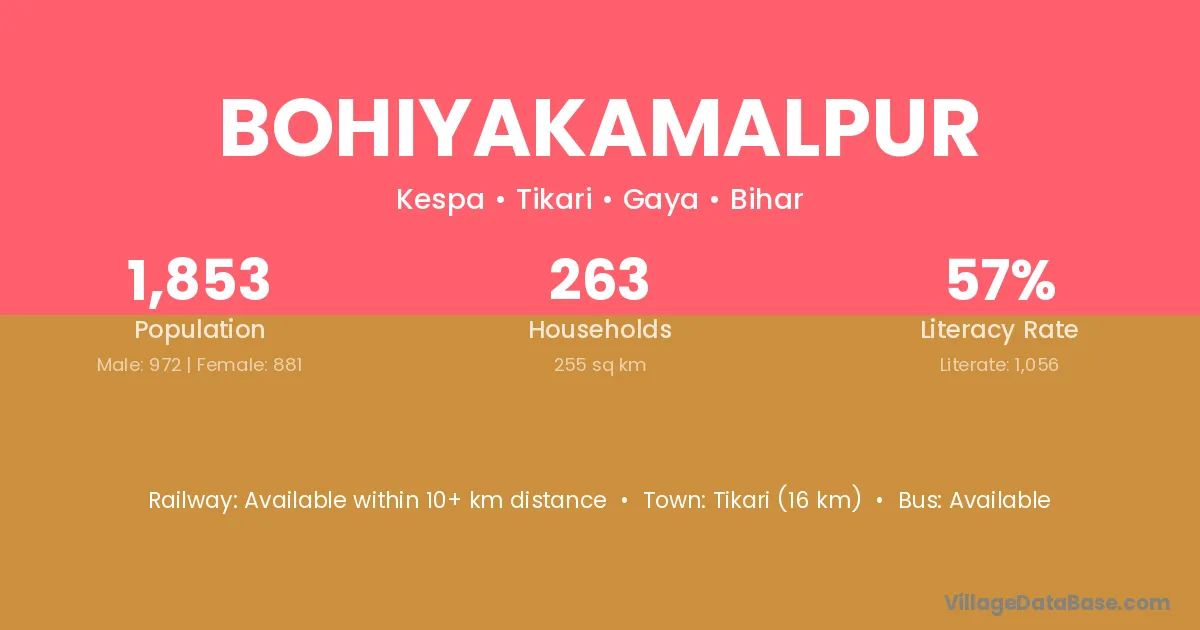 Bohiyakamalpur village has a total population of 1,853 people, of which 972 are males and 881 are females.