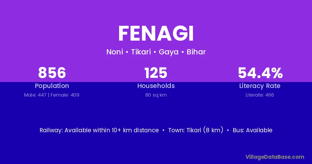 Tikari (8 km) is the nearest town to Fenagi village for major economic activities and is located approximately 8 km away.