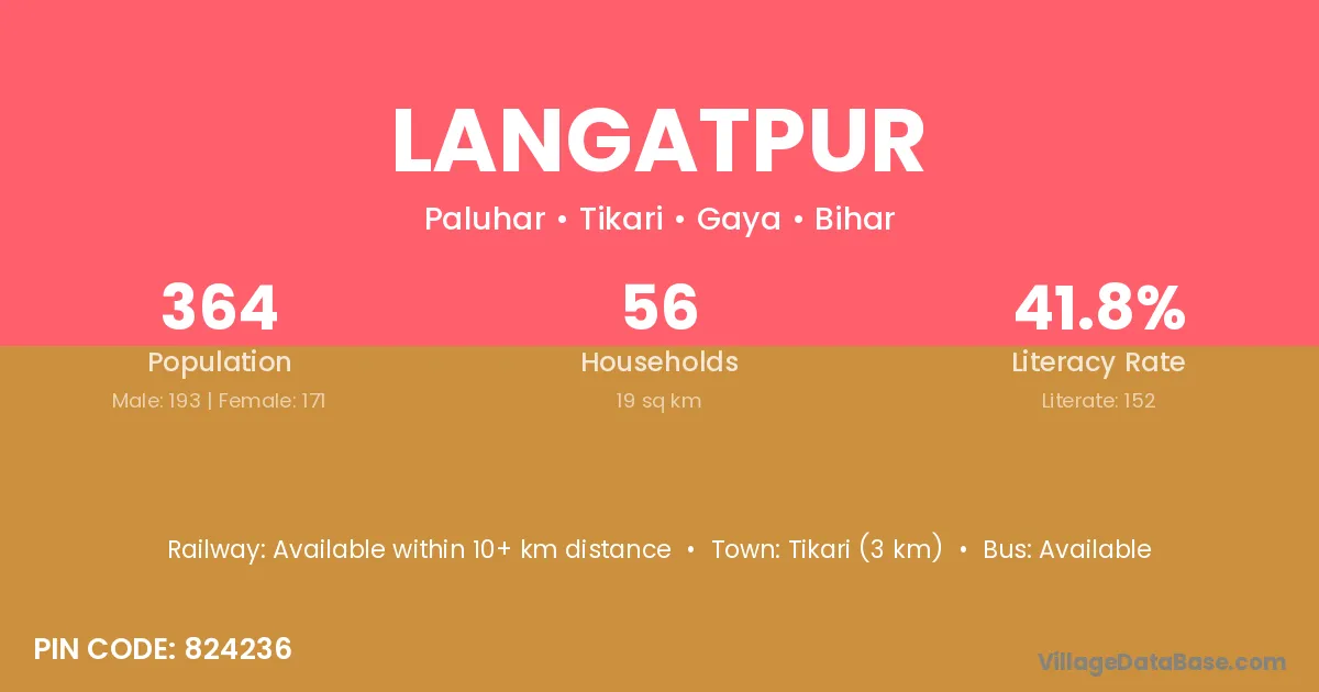 Langatpur village has a total population of 364 people, of which 193 are males and 171 are females.