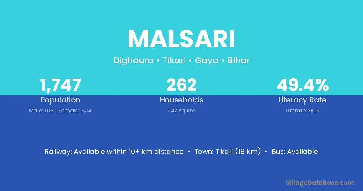 Tikari (18 km) is the nearest town to Malsari village for major economic activities and is located approximately 18 km away.