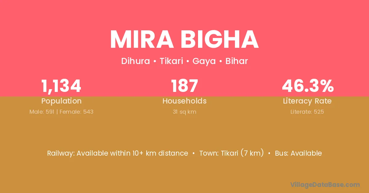 Tikari (7 km) is the nearest town to Mira Bigha village for major economic activities and is located approximately 7 km away.