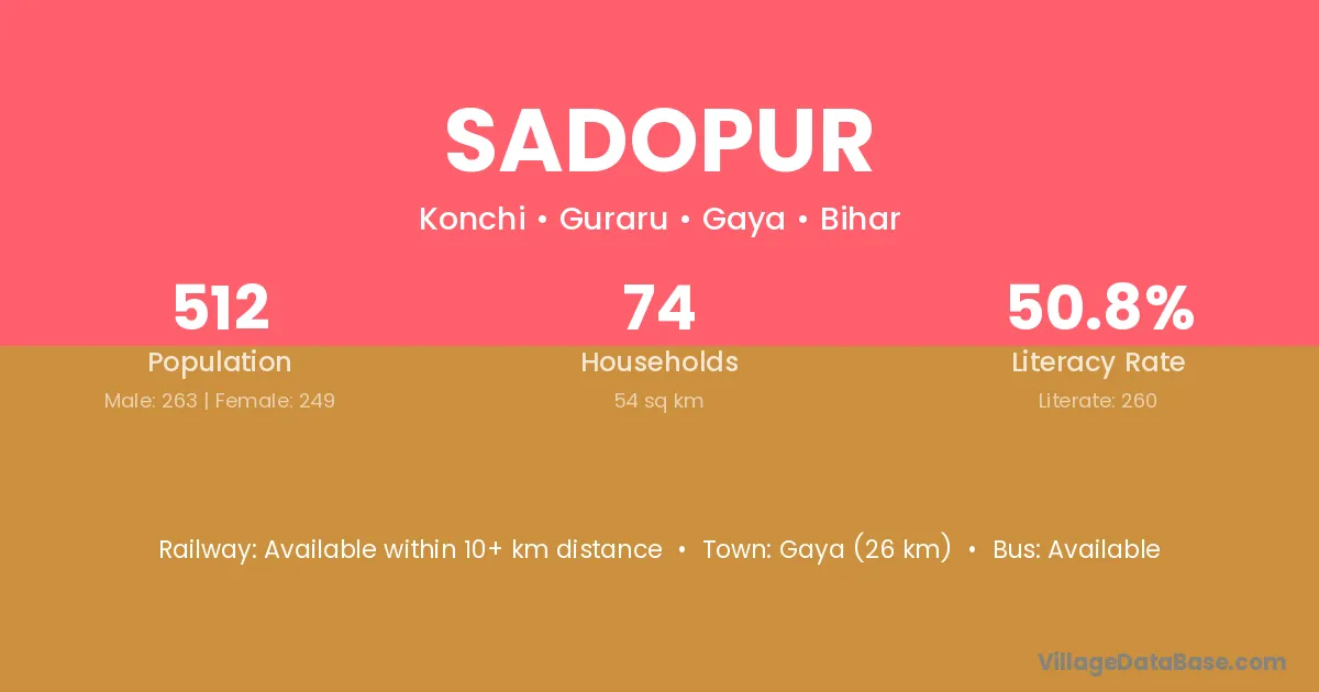 Tikari (14 km) is the nearest town to Sadopur village for major economic activities and is located approximately 14 km away.