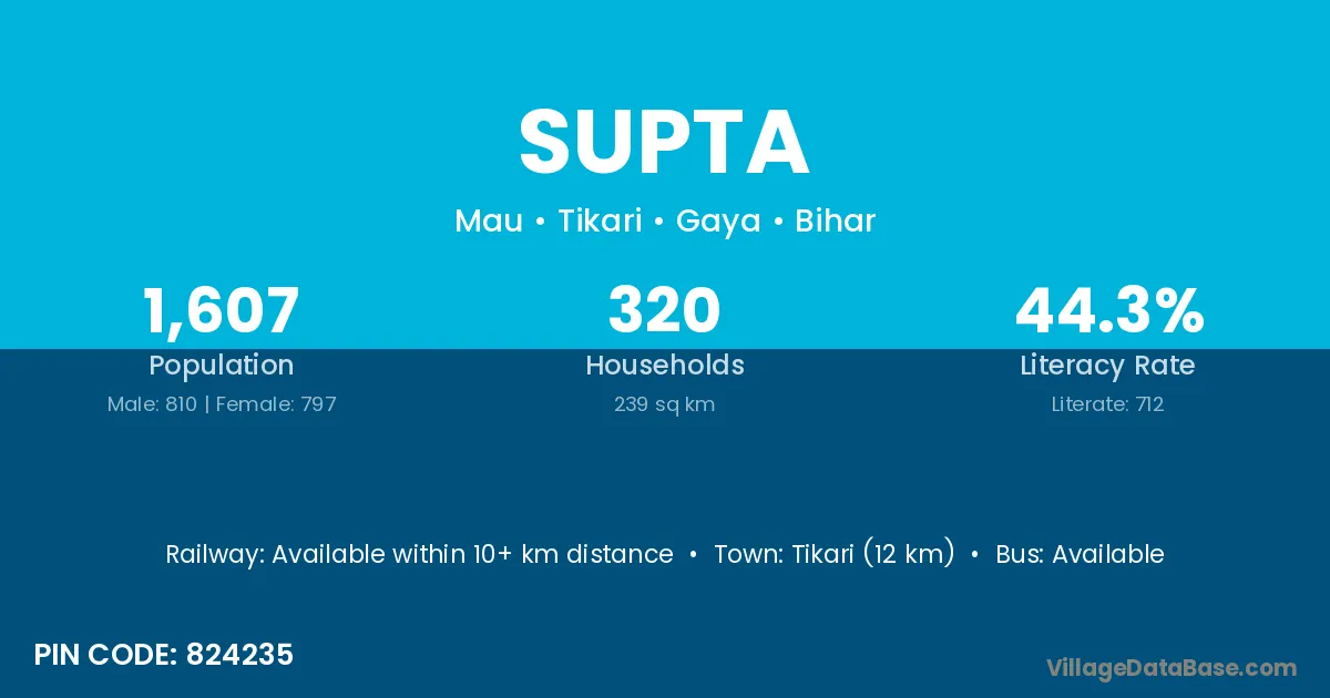 Tikari (12 km) is the nearest town to Supta village for major economic activities and is located approximately 12 km away.