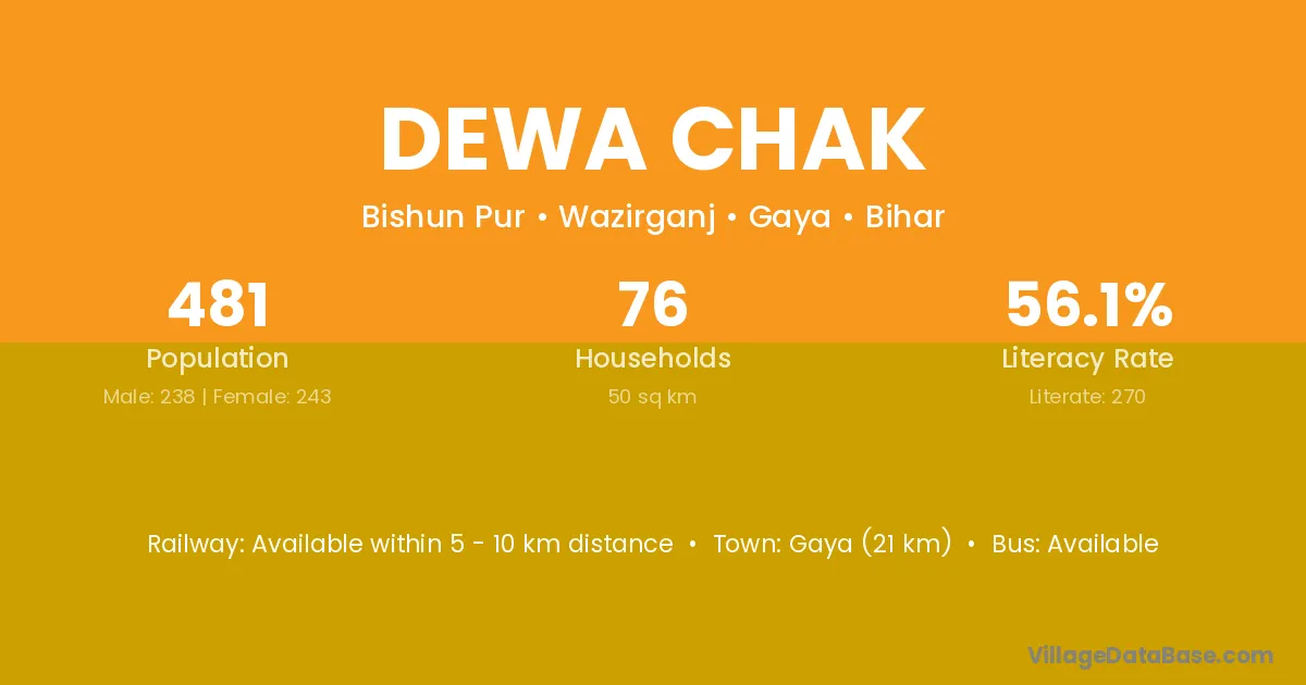 Gaya (21 km) is the nearest town to Dewa Chak village for major economic activities and is located approximately 21 km away.