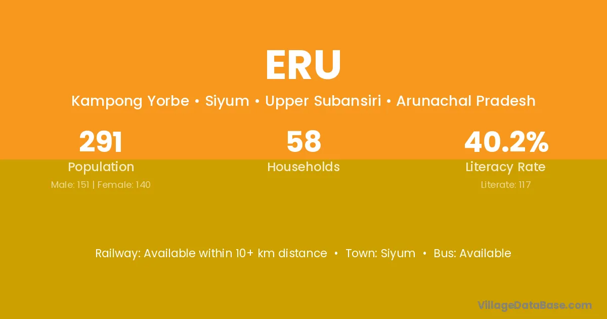 The literacy rate of Eru village is 50.44%. Male literacy stands at 54.25% and female literacy at 46.11%.