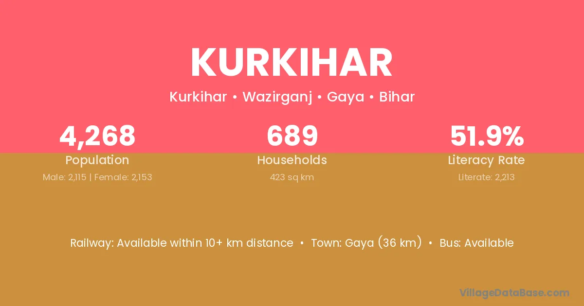 Kurkihar village has a total population of 4,268 people, of which 2,115 are males and 2,153 are females.